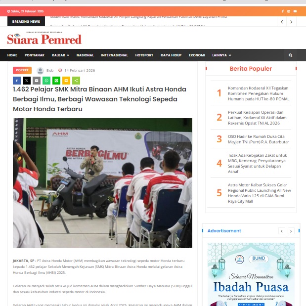 1.462 Pelajar SMK Mitra Binaan AHM Ikuti Astra Honda Berbagi Ilmu, Berbagi Wawasan Teknologi Sepeda Motor Honda Terbaru by masmul 14 Februari 2026 in Silahkan kunjungi https://www.suarapemredkalbar.com/read/potret/14022026/1462-pelajar-smk-mitra-binaan-ahm-ikuti-astra-honda-berbagi-ilmu-berbagi-wawasan-teknologi-sepeda-motor-honda-terbaru. You Might Like Regional Public Launching New ADV160 The SUV Pride Grand Launching New PCX 160 Truly Exceptional! Tetap hati-hati ya bro sist berkendara saat hujan.
