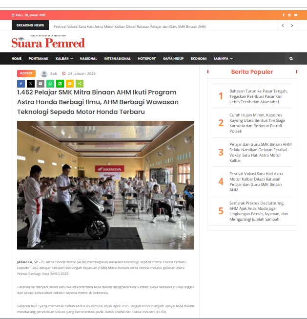 1.462 Pelajar SMK Mitra Binaan AHM Ikuti Program Astra Honda Berbagi Ilmu, AHM Berbagi Wawasan Teknologi Sepeda Motor Honda Terbaru by masmul 24 Januari 2026 in Silahkan kunjungi https://www.suarapemredkalbar.com/read/potret/24012026/1462-pelajar-smk-mitra-binaan-ahm-ikuti-program-astra-honda-berbagi-ilmu-ahm-berbagi-wawasan-teknologi-sepeda-motor-honda-terbaru. You Might Like Regional Public Launching New ADV160 The SUV Pride Grand Launching New PCX 160 Truly Exceptional! Tetap hati-hati ya bro sist berkendara saat hujan.