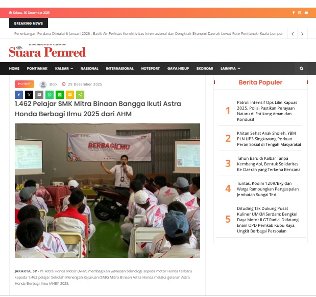 1.462 Pelajar SMK Mitra Binaan Bangga Ikuti Astra Honda Berbagi Ilmu 2025 dari AHM by masmul 29 Desember 2025 in Silahkan kunjungi https://www.suarapemredkalbar.com/read/potret/29122025/1462-pelajar-smk-mitra-binaan-bangga-ikuti-astra-honda-berbagi-ilmu-2025-dari-ahm. You Might Like Regional Public Launching New ADV160 The SUV Pride Grand Launching New PCX 160 Truly Exceptional! Tetap hati-hati ya bro sist berkendara saat hujan.