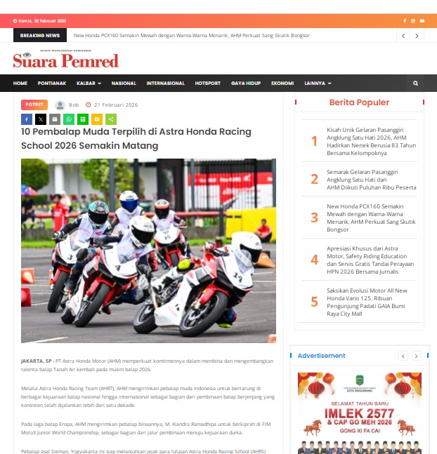 10 Pembalap Muda Terpilih di Astra Honda Racing School 2026 Semakin Matang by masmul 21 Februari 2026 in Silahkan kunjungi https://www.suarapemredkalbar.com/read/potret/21022026/10-pembalap-muda-terpilih-di-astra-honda-racing-school-2026-semakin-matang. You Might Like Regional Public Launching New ADV160 The SUV Pride Grand Launching New PCX 160 Truly Exceptional! Tetap hati-hati ya bro sist berkendara saat hujan.