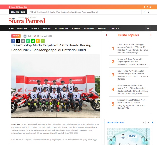 10 Pembalap Muda Terpilih di Astra Honda Racing School 2026 Siap Mengaspal di Lintasan Dunia by masmul 22 Februari 2026 in Silahkan kunjungi https://www.suarapemredkalbar.com/read/potret/22022026/10-pembalap-muda-terpilih-di-astra-honda-racing-school-2026-siap-mengaspal-di-lintasan-dunia. You Might Like Regional Public Launching New ADV160 The SUV Pride Grand Launching New PCX 160 Truly Exceptional! Tetap hati-hati ya bro sist berkendara saat hujan.
