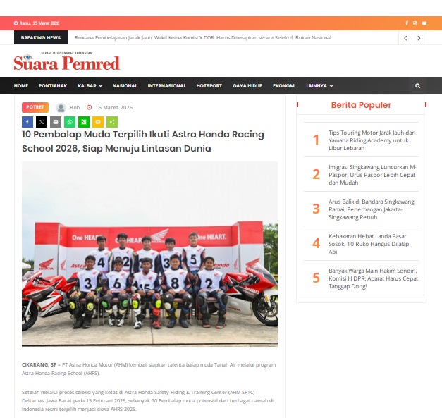 10 Pembalap Muda Terpilih Ikuti Astra Honda Racing School 2026, Siap Menuju Lintasan Dunia by masmul 16 Maret 2026 in Silahkan kunjungi https://www.suarapemredkalbar.com/read/potret/16032026/10-pembalap-muda-terpilih-ikuti-astra-honda-racing-school-2026-siap-menuju-lintasan-dunia. You Might Like Regional Public Launching New ADV160 The SUV Pride Grand Launching New PCX 160 Truly Exceptional! Tetap hati-hati ya bro sist berkendara saat hujan.