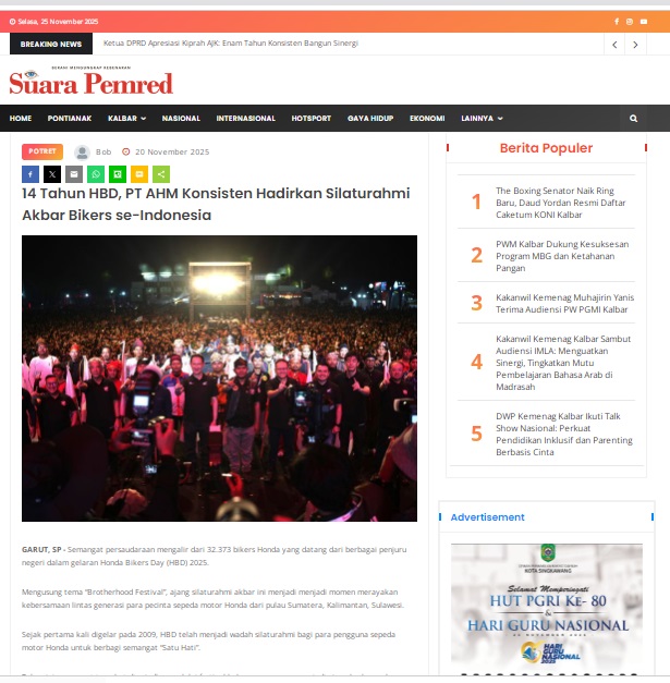 14 Tahun HBD, PT AHM Konsisten Hadirkan Silaturahmi Akbar Bikers se-Indonesia by masmul 20 November 2025 in Silahkan kunjungi https://www.suarapemredkalbar.com/read/potret/20112025/14-tahun-hbd-pt-ahm-konsisten-hadirkan-silaturahmi-akbar-bikers-se-indonesia. You Might Like Regional Public Launching New ADV160 The SUV Pride Grand Launching New PCX 160 Truly Exceptional! Tetap hati-hati ya bro sist berkendara saat hujan.