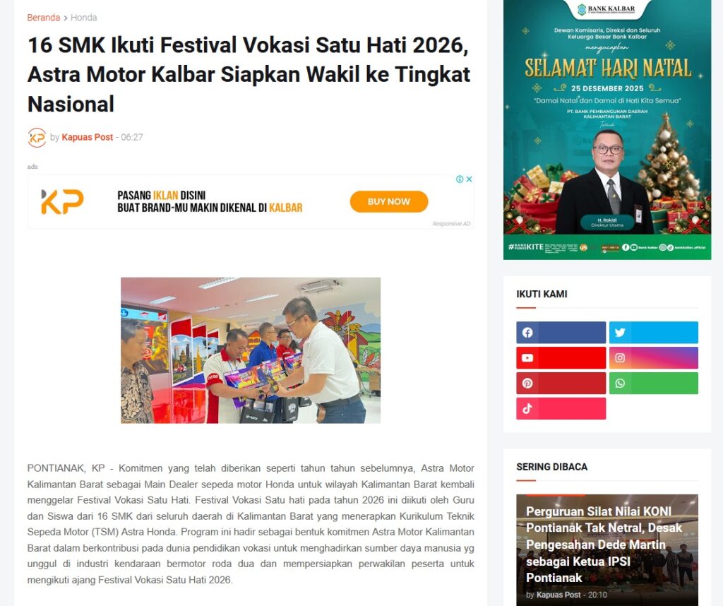 16 SMK Ikuti Festival Vokasi Satu Hati 2026, Astra Motor Kalbar Siapkan Wakil ke Tingkat Nasional by Muhammad Arif 30 Desember 2025 in Silahkan kunjungi https://www.kapuaspost.web.id/2025/12/16-smk-ikuti-festival-vokasi-satu-hati.html. Tags: astra Astra Motor kalbar Astra Motor Pontianak astramotor honda kalbar pontianak sepeda motor You Might Like Regional Public Launching New ADV160 The SUV Pride Grand Launching New PCX 160 Truly Exceptional! Tetap hati-hati ya bro sist berkendara saat hujan.