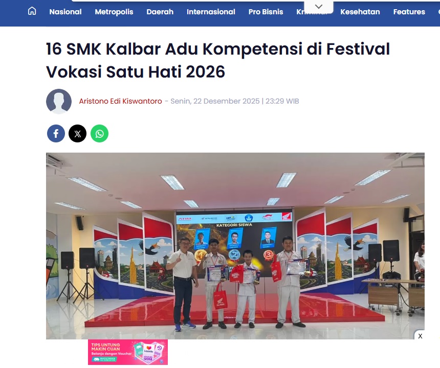 16 SMK Kalbar Adu Kompetensi di Festival Vokasi Satu Hati 2026 by Aristono Edi Kiswantoro 22 Desember 2025 in Silahkan kunjungi https://pontianakpost.jawapos.com/pro-bisnis/1466987555/16-smk-kalbar-adu-kompetensi-di-festival-vokasi-satu-hati-2026. You Might Like Regional Public Launching New ADV160 The SUV Pride Grand Launching New PCX 160 Truly Exceptional! Tetap hati-hati ya bro sist berkendara saat hujan.