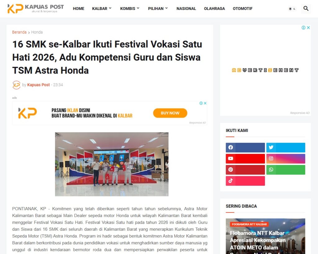 16 SMK se-Kalbar Ikuti Festival Vokasi Satu Hati 2026, Adu Kompetensi Guru dan Siswa TSM Astra Honda by Muhammad Arif 6 Februari 2026 in Silahkan kunjungi https://www.kapuaspost.web.id/2026/02/16-smk-se-kalbar-ikuti-festival-vokasi.html. Tags: astra Astra Motor kalbar Astra Motor Pontianak astramotor honda kalbar pontianak sepeda motor You Might Like Regional Public Launching New ADV160 The SUV Pride Grand Launching New PCX 160 Truly Exceptional! Tetap hati-hati ya bro sist berkendara saat hujan.
