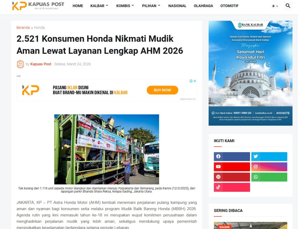2.521 Konsumen Honda Nikmati Mudik Aman Lewat Layanan Lengkap AHM 2026 by Muhammad Arif 24 Maret 2026 in Silahkan kunjungi https://www.kapuaspost.web.id/2026/03/2521-konsumen-honda-nikmati-mudik-aman.html. Tags: astra Astra Motor kalbar Astra Motor Pontianak astramotor honda kalbar pontianak sepeda motor You Might Like Regional Public Launching New ADV160 The SUV Pride Grand Launching New PCX 160 Truly Exceptional! Tetap hati-hati ya bro sist berkendara saat hujan.