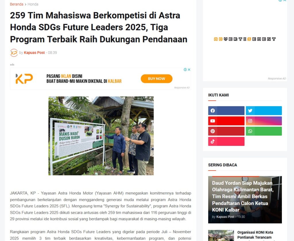 259 Tim Mahasiswa Berkompetisi di Astra Honda SDGs Future Leaders 2025, Tiga Program Terbaik Raih Dukungan Pendanaan by Muhammad Arif 9 Desember 2025 in Silahkan kunjungi https://www.kapuaspost.web.id/2025/12/259-tim-mahasiswa-berkompetisi-di-astra.html. Tags: astra Astra Motor kalbar Astra Motor Pontianak astramotor honda kalbar pontianak sepeda motor You Might Like Regional Public Launching New ADV160 The SUV Pride Grand Launching New PCX 160 Truly Exceptional! Tetap hati-hati ya bro sist berkendara saat hujan.