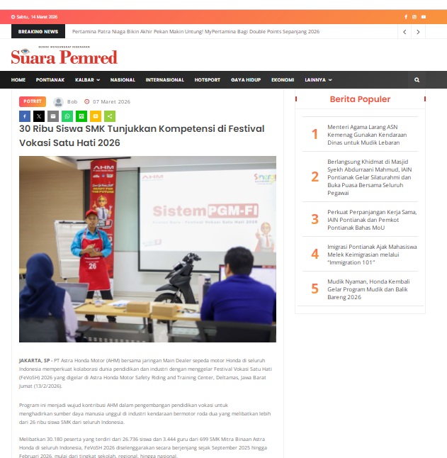 30 Ribu Siswa SMK Tunjukkan Kompetensi di Festival Vokasi Satu Hati 2026 by masmul 7 Maret 2026 in Silahkan kunjungi https://www.suarapemredkalbar.com/read/potret/07032026/30-ribu-siswa-smk-tunjukkan-kompetensi-di-festival-vokasi-satu-hati-2026. You Might Like Regional Public Launching New ADV160 The SUV Pride Grand Launching New PCX 160 Truly Exceptional! Tetap hati-hati ya bro sist berkendara saat hujan.