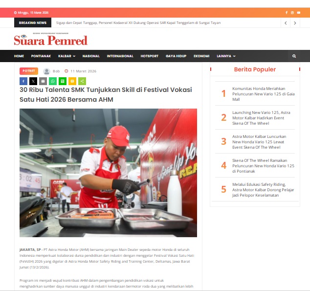 30 Ribu Talenta SMK Tunjukkan Skill di Festival Vokasi Satu Hati 2026 Bersama AHM by masmul 11 Maret 2026 in Silahkan kunjungi https://www.suarapemredkalbar.com/read/potret/11032026/30-ribu-talenta-smk-tunjukkan-skill-di-festival-vokasi-satu-hati-2026-bersama-ahm. You Might Like Regional Public Launching New ADV160 The SUV Pride Grand Launching New PCX 160 Truly Exceptional! Tetap hati-hati ya bro sist berkendara saat hujan.