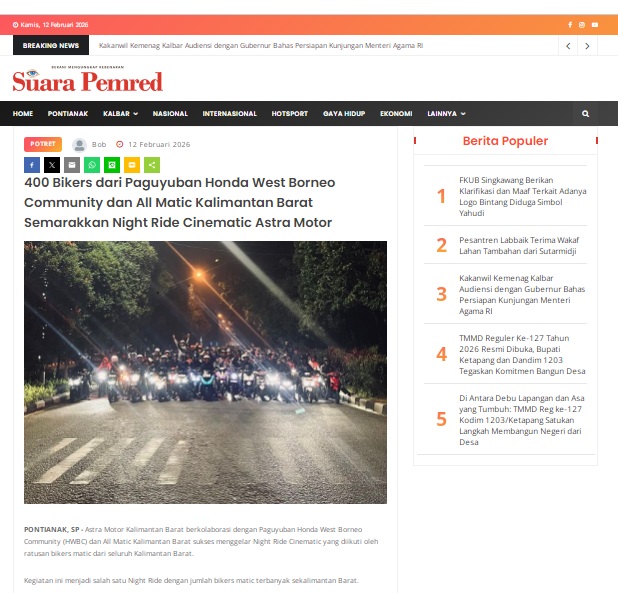 400 Bikers dari Paguyuban Honda West Borneo Community dan All Matic Kalimantan Barat Semarakkan Night Ride Cinematic Astra Motor by masmul 12 Februari 2026 in Silahkan kunjungi https://www.suarapemredkalbar.com/read/potret/12022026/400-bikers-dari-paguyuban-honda-west-borneo-community-dan-all-matic-kalimantan-barat-semarakkan-night-ride-cinematicastra-motor. You Might Like Regional Public Launching New ADV160 The SUV Pride Grand Launching New PCX 160 Truly Exceptional! Tetap hati-hati ya bro sist berkendara saat hujan.