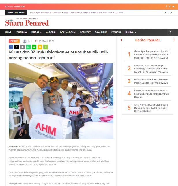 60 Bus dan 32 Truk Disiapkan AHM untuk Mudik Balik Bareng Honda Tahun Ini by masmul 23 Maret 2026 in Silahkan kunjungi https://www.suarapemredkalbar.com/read/potret/23032026/60-bus-dan-32-truk-disiapkan-ahm-untuk-mudik-balik-bareng-honda-tahun-ini. You Might Like Regional Public Launching New ADV160 The SUV Pride Grand Launching New PCX 160 Truly Exceptional! Tetap hati-hati ya bro sist berkendara saat hujan.