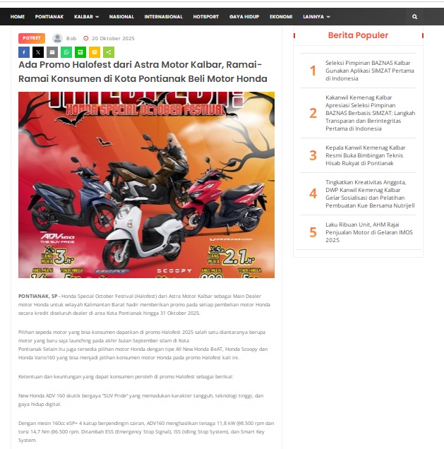 Ada Promo Halofest dari Astra Motor Kalbar, Ramai-Ramai Konsumen di Kota Pontianak Beli Motor Honda by masmul 20 Oktober 2025 in Silahkan kunjungi https://www.suarapemredkalbar.com/read/potret/20102025/ada-promo-halofest-dari-astra-motor-kalbar-ramai-ramai-konsumen-di-kota-pontianak-beli-motor-honda. You Might Like Regional Public Launching New ADV160 The SUV Pride Grand Launching New PCX 160 Truly Exceptional! Tetap hati-hati ya bro sist berkendara saat hujan.