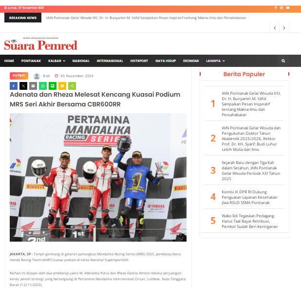 Adenata dan Rheza Melesat Kencang Kuasai Podium MRS Seri Akhir Bersama CBR600RR by masmul 5 November 2025 in Silahkan kunjungi https://www.suarapemredkalbar.com/read/potret/05112025/adenata-dan-rheza-melesat-kencang-kuasai-podium-mrs-seri-akhir-bersama-cbr600rr. You Might Like Regional Public Launching New ADV160 The SUV Pride Grand Launching New PCX 160 Truly Exceptional! Tetap hati-hati ya bro sist berkendara saat hujan.