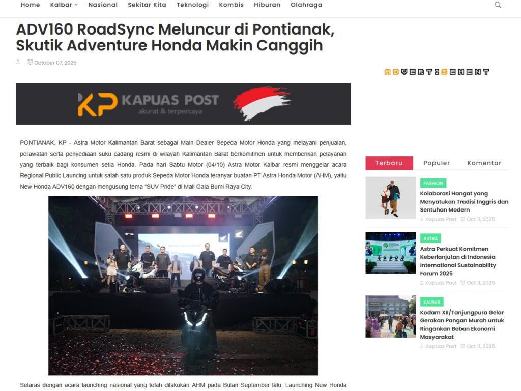 ADV160 RoadSync Meluncur di Pontianak, Skutik Adventure Honda Makin Canggih by Muhammad Arif 8 Oktober 2025 in Silahkan kunjungi https://www.kapuaspost.web.id/2025/10/adv160-roadsync-meluncur-di-pontianak.html`. Tags: astra Astra Motor kalbar Astra Motor Pontianak astramotor honda kalbar pontianak sepeda motor You Might Like Regional Public Launching New ADV160 The SUV Pride Grand Launching New PCX 160 Truly Exceptional! Tetap hati-hati ya bro sist berkendara saat hujan.