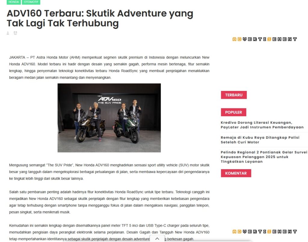 ADV160 Terbaru: Skutik Adventure yang Tak Lagi Tak Terhubung by Muhammad Arif 8 September 2025 in Silahkan kunjungi https://www.kapuaspost.web.id/2025/09/adv160-terbaru-skutik-adventure-yang.html. Tags: astra Astra Motor kalbar Astra Motor Pontianak astramotor honda kalbar pontianak sepeda motor You Might Like Regional Public Launching New ADV160 The SUV Pride Grand Launching New PCX 160 Truly Exceptional! Tetap hati-hati ya bro sist berkendara saat hujan.