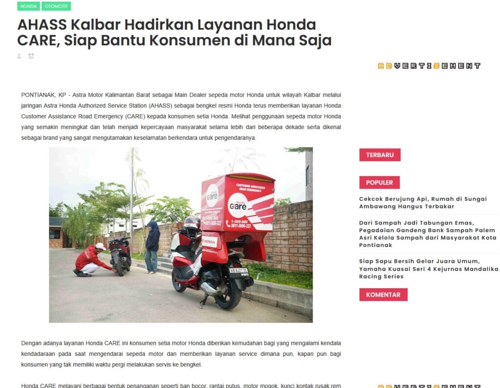 AHASS Kalbar Hadirkan Layanan Honda CARE, Siap Bantu Konsumen di Mana Saja by Muhammad Arif 29 September 2025 in Silahkan kunjungi https://www.kapuaspost.web.id/2025/09/ahass-kalbar-hadirkan-layanan-honda.html. Tags: astra Astra Motor kalbar Astra Motor Pontianak astramotor honda kalbar pontianak sepeda motor You Might Like Regional Public Launching New ADV160 The SUV Pride Grand Launching New PCX 160 Truly Exceptional! Tetap hati-hati ya bro sist berkendara saat hujan.
