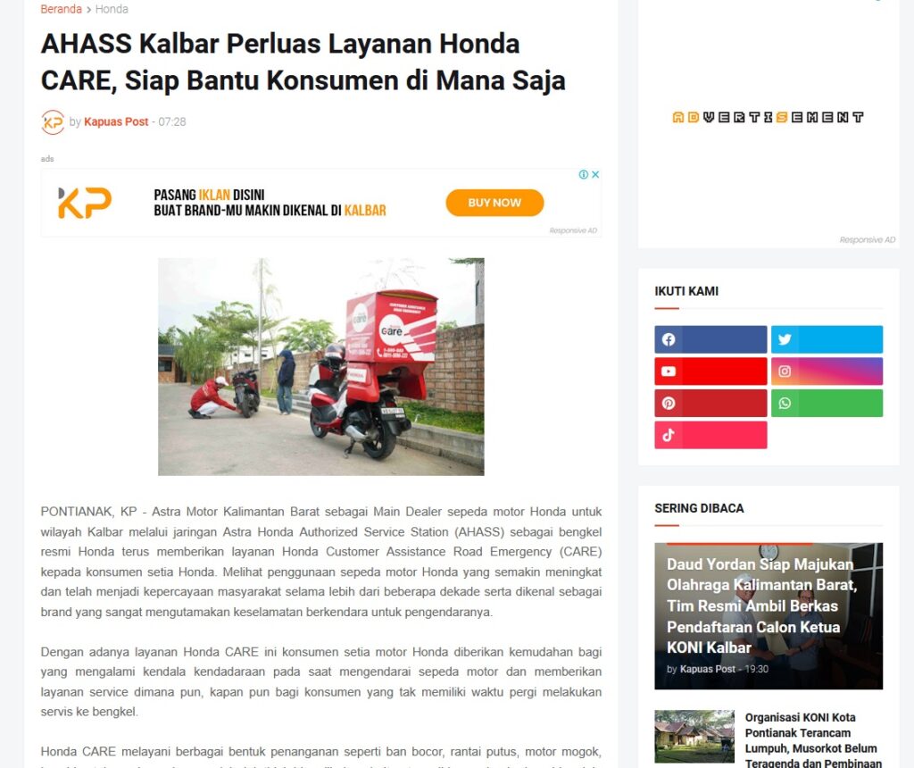 AHASS Kalbar Perluas Layanan Honda CARE, Siap Bantu Konsumen di Mana Saja by Muhammad Arif 1 Desember 2025 in Silahkan kunjungi https://www.kapuaspost.web.id/2025/12/ahass-kalbar-perluas-layanan-honda-care.html. Tags: astra Astra Motor kalbar Astra Motor Pontianak astramotor honda kalbar pontianak sepeda motor You Might Like Regional Public Launching New ADV160 The SUV Pride Grand Launching New PCX 160 Truly Exceptional! Tetap hati-hati ya bro sist berkendara saat hujan.