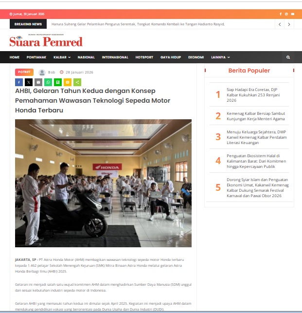 AHBI, Gelaran Tahun Kedua dengan Konsep Pemahaman Wawasan Teknologi Sepeda Motor Honda Terbaru by masmul 28 Januari 2026 in Silahkan kunjungi https://www.suarapemredkalbar.com/read/potret/28012026/ahbi-gelaran-tahun-kedua-dengan-konsep-pemahaman-wawasan-teknologi-sepeda-motor-honda-terbaru. You Might Like Regional Public Launching New ADV160 The SUV Pride Grand Launching New PCX 160 Truly Exceptional! Tetap hati-hati ya bro sist berkendara saat hujan.