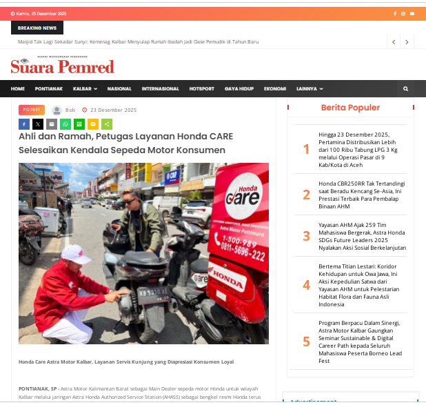 Ahli dan Ramah, Petugas Layanan Honda CARE Selesaikan Kendala Sepeda Motor Konsumen by masmul 23 Desember 2025 in Silahkan kunjungi https://www.suarapemredkalbar.com/read/potret/23122025/ahli-dan-ramah-petugas-layanan-honda-care-selesaikan-kendala-sepeda-motor-konsumen. You Might Like Regional Public Launching New ADV160 The SUV Pride Grand Launching New PCX 160 Truly Exceptional! Tetap hati-hati ya bro sist berkendara saat hujan.