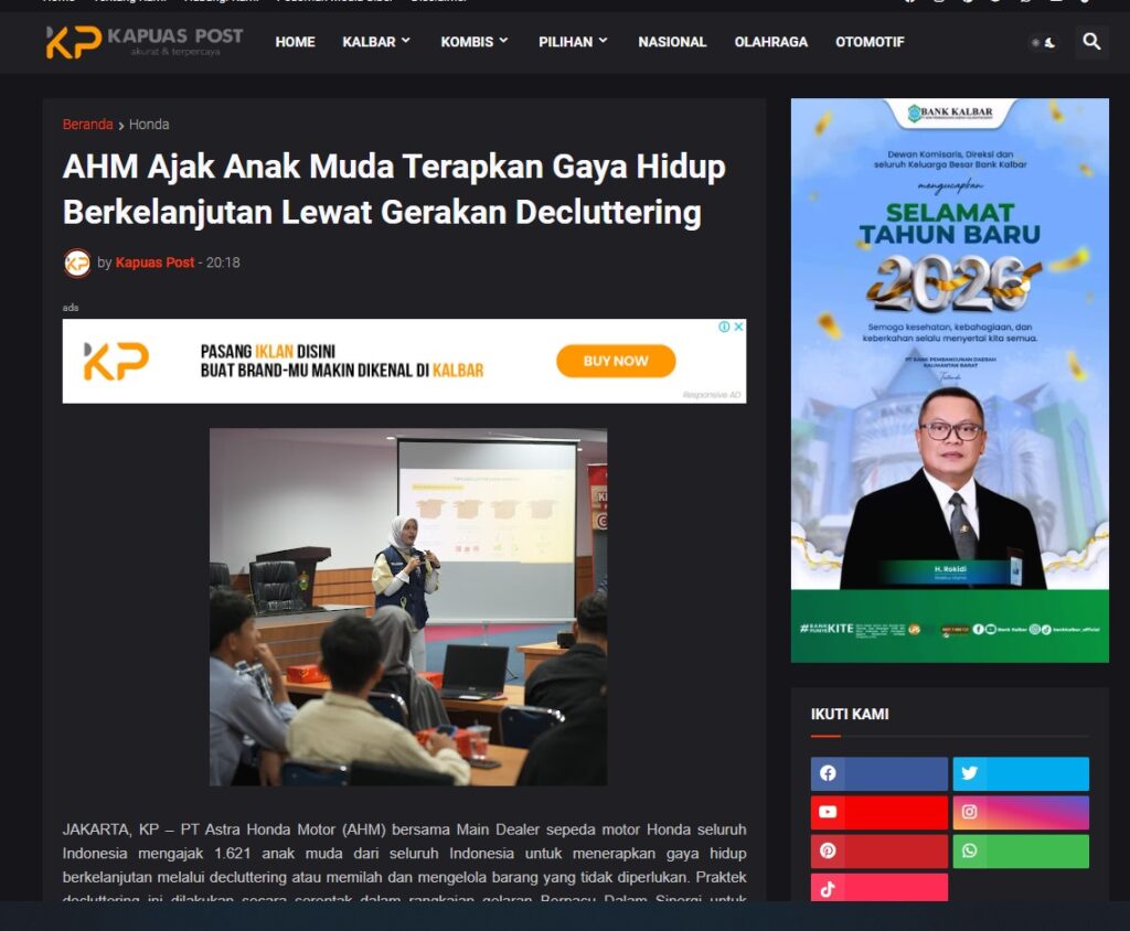 AHM Ajak Anak Muda Terapkan Gaya Hidup Berkelanjutan Lewat Gerakan Decluttering by Muhammad Arif 4 Januari 2026 in Silahkan kunjungi https://www.kapuaspost.web.id/2026/01/ahm-ajak-anak-muda-terapkan-gaya-hidup.html. Tags: astra Astra Motor kalbar Astra Motor Pontianak astramotor honda kalbar pontianak sepeda motor You Might Like Regional Public Launching New ADV160 The SUV Pride Grand Launching New PCX 160 Truly Exceptional! Tetap hati-hati ya bro sist berkendara saat hujan.