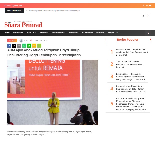 AHM Ajak Anak Muda Terapkan Gaya Hidup Decluttering, Jaga Kehidupan Berkelanjutan by masmul 16 Januari 2026 in Silahkan kunjungi https://www.suarapemredkalbar.com/read/potret/16012026/ahm-ajak-anak-muda-terapkan-gaya-hidup-decluttering-jaga-kehidupan-berkelanjutan. You Might Like Regional Public Launching New ADV160 The SUV Pride Grand Launching New PCX 160 Truly Exceptional! Tetap hati-hati ya bro sist berkendara saat hujan.