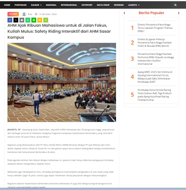 AHM Ajak Ribuan Mahasiswa untuk di Jalan Fokus, Kuliah Mulus: Safety Riding Interaktif dari AHM Sasar Kampus by masmul 14 Oktober 2025 in Silahkan kunjungi https://www.suarapemredkalbar.com/read/potret/14102025/ahm-ajak-ribuan-mahasiswa-untuk-di-jalan-fokus-kuliah-mulus-safety-riding-interaktif-dari-ahm-sasar-kampus. You Might Like Regional Public Launching New ADV160 The SUV Pride Grand Launching New PCX 160 Truly Exceptional! Tetap hati-hati ya bro sist berkendara saat hujan.