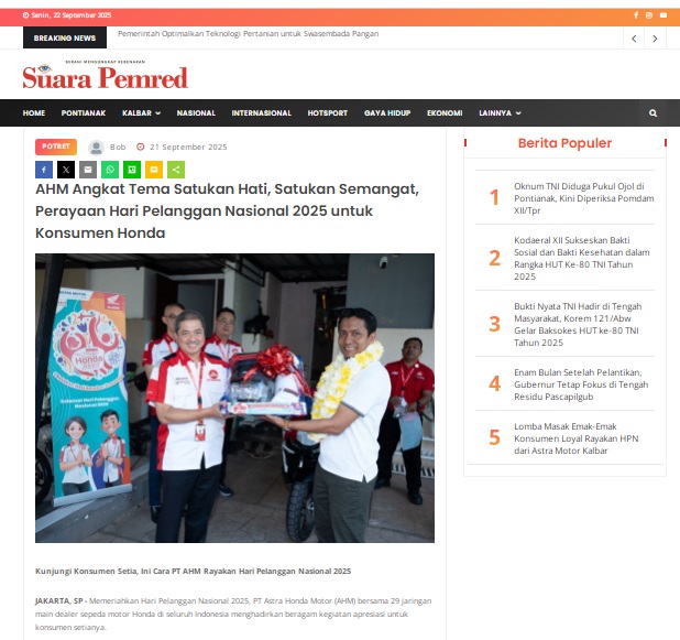 AHM Angkat Tema Satukan Hati, Satukan Semangat, Perayaan Hari Pelanggan Nasional 2025 untuk Konsumen Honda by masmul 21 September 2025 in Silahkan kunjungi https://www.suarapemredkalbar.com/read/potret/21092025/ahm-angkat-tema-satukan-hati-satukan-semangat-perayaan-hari-pelanggan-nasional-2025-untuk-konsumen-honda. You Might Like Regional Public Launching New ADV160 The SUV Pride Grand Launching New PCX 160 Truly Exceptional! Tetap hati-hati ya bro sist berkendara saat hujan.