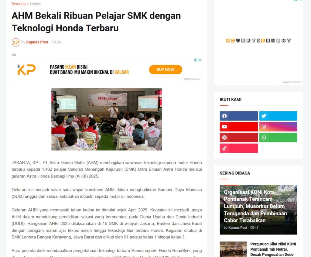 AHM Bekali Ribuan Pelajar SMK dengan Teknologi Honda Terbaru by Muhammad Arif 13 Desember 2025 in Silahkan kunjungi https://www.kapuaspost.web.id/2025/12/ahm-bekali-ribuan-pelajar-smk-dengan.html. Tags: astra Astra Motor kalbar Astra Motor Pontianak astramotor honda kalbar pontianak sepeda motor You Might Like Regional Public Launching New ADV160 The SUV Pride Grand Launching New PCX 160 Truly Exceptional! Tetap hati-hati ya bro sist berkendara saat hujan.