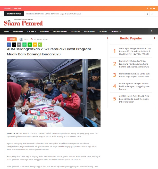 AHM Berangkatkan 2.521 Pemudik Lewat Program Mudik Balik Bareng Honda 2026 by masmul 23 Maret 2026 in Silahkan kunjungi https://www.suarapemredkalbar.com/read/potret/23032026/ahm-berangkatkan-2521-pemudik-lewat-program-mudik-balik-bareng-honda-2026. You Might Like Regional Public Launching New ADV160 The SUV Pride Grand Launching New PCX 160 Truly Exceptional! Tetap hati-hati ya bro sist berkendara saat hujan.