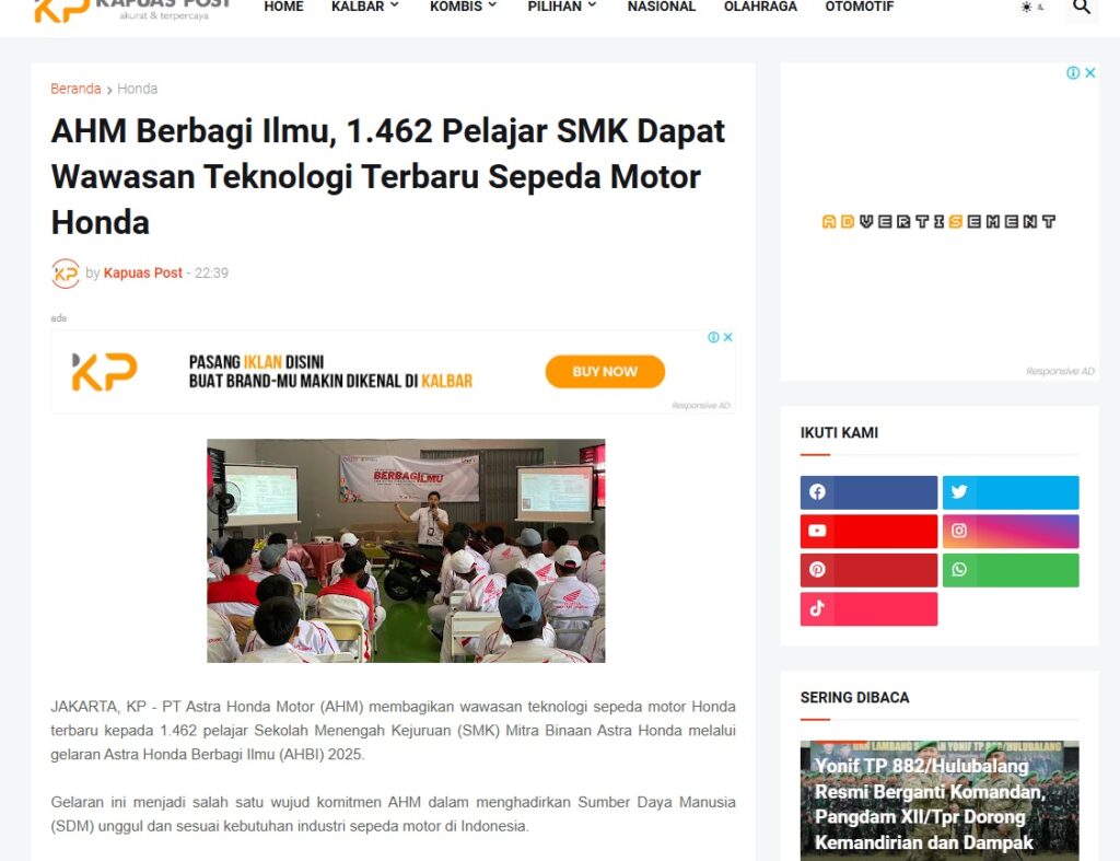 AHM Berbagi Ilmu, 1.462 Pelajar SMK Dapat Wawasan Teknologi Terbaru Sepeda Motor Honda by Muhammad Arif 21 Januari 2026 in Silahkan kunjungi https://www.kapuaspost.web.id/2026/01/ahm-berbagi-ilmu-1462-pelajar-smk-dapat.html. Tags: astra Astra Motor kalbar Astra Motor Pontianak astramotor honda kalbar pontianak sepeda motor You Might Like Regional Public Launching New ADV160 The SUV Pride Grand Launching New PCX 160 Truly Exceptional! Tetap hati-hati ya bro sist berkendara saat hujan.
