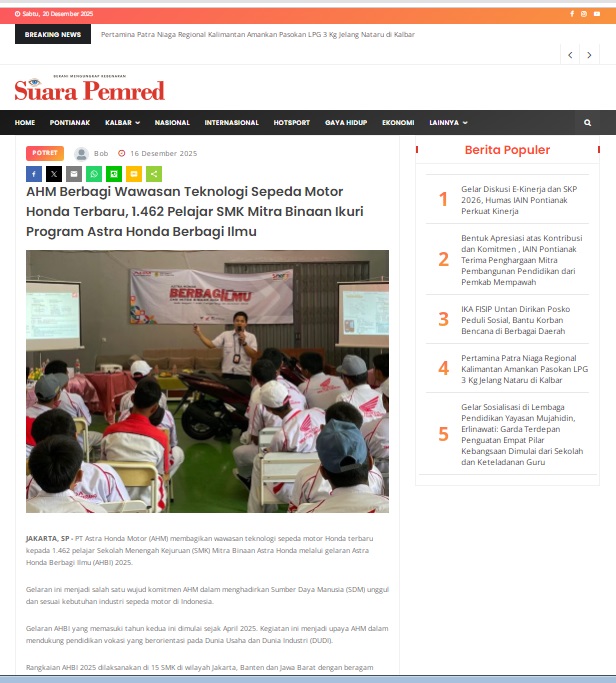 AHM Berbagi Wawasan Teknologi Sepeda Motor Honda Terbaru, 1.462 Pelajar SMK Mitra Binaan Ikuri Program Astra Honda Berbagi Ilmu by masmul 16 Desember 2025 in Silahkan kunjungi https://www.suarapemredkalbar.com/read/potret/16122025/ahm-berbagi-wawasan-teknologi-sepeda-motor-honda-terbaru-1462-pelajar-smk-mitra-binaanikuri-program-astra-honda-berbagi-ilmu. You Might Like Regional Public Launching New ADV160 The SUV Pride Grand Launching New PCX 160 Truly Exceptional! Tetap hati-hati ya bro sist berkendara saat hujan.