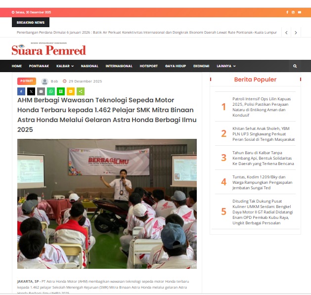 AHM Berbagi Wawasan Teknologi Sepeda Motor Honda Terbaru kepada 1.462 Pelajar SMK Mitra Binaan Astra Honda Melalui Gelaran Astra Honda Berbagi Ilmu 2025 by masmul 29 Desember 2025 in Silahkan kunjungi https://www.suarapemredkalbar.com/read/potret/29122025/ahm-berbagi-wawasan-teknologi-sepeda-motor-honda-terbaru-kepada-1462-pelajar-smk-mitra-binaan-astra-honda-melalui-gelaran-astra-honda-berbagi-ilmu-2025. You Might Like Regional Public Launching New ADV160 The SUV Pride Grand Launching New PCX 160 Truly Exceptional! Tetap hati-hati ya bro sist berkendara saat hujan.
