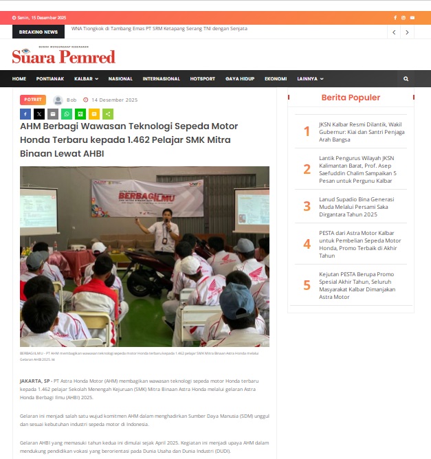 AHM Berbagi Wawasan Teknologi Sepeda Motor Honda Terbaru kepada 1.462 Pelajar SMK Mitra Binaan Lewat AHBI by masmul 14 Desember 2025 in Silahkan kunjungi https://www.suarapemredkalbar.com/read/potret/14122025/ahm-berbagi-wawasan-teknologi-sepeda-motor-honda-terbaru-kepada-1462-pelajar-smk-mitra-binaanlewat-ahbi. You Might Like Regional Public Launching New ADV160 The SUV Pride Grand Launching New PCX 160 Truly Exceptional! Tetap hati-hati ya bro sist berkendara saat hujan.
