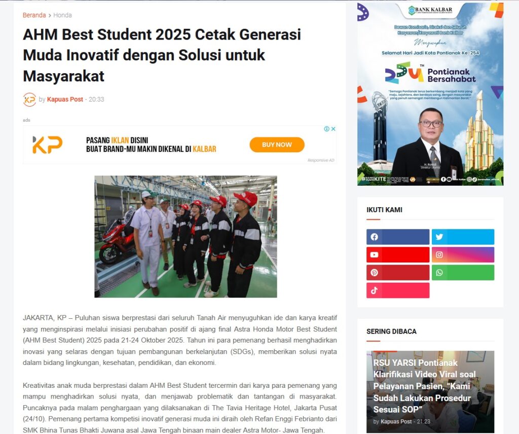 AHM Best Student 2025 Cetak Generasi Muda Inovatif dengan Solusi untuk Masyarakat by Muhammad Arif 13 November 2025 in Silahkan kunjungi https://www.kapuaspost.web.id/2025/11/ahm-best-student-2025-cetak-generasi.html. Tags: astra Astra Motor kalbar Astra Motor Pontianak astramotor honda kalbar pontianak sepeda motor You Might Like Regional Public Launching New ADV160 The SUV Pride Grand Launching New PCX 160 Truly Exceptional! Tetap hati-hati ya bro sist berkendara saat hujan.
