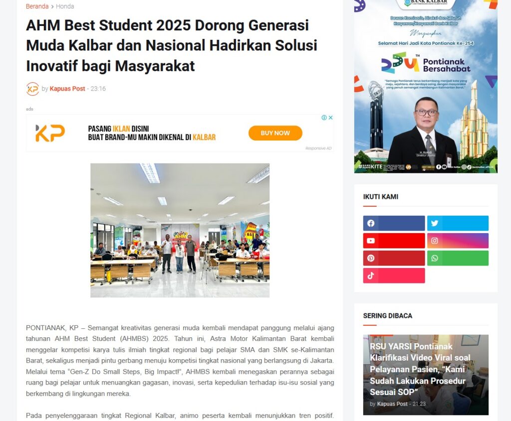 AHM Best Student 2025 Dorong Generasi Muda Kalbar dan Nasional Hadirkan Solusi Inovatif bagi Masyarakat by Muhammad Arif 6 November 2025 in Silahkan kunjungi https://www.kapuaspost.web.id/2025/11/ahm-best-student-2025-dorong-generasi.html. Tags: astra Astra Motor kalbar Astra Motor Pontianak astramotor honda kalbar pontianak sepeda motor You Might Like Regional Public Launching New ADV160 The SUV Pride Grand Launching New PCX 160 Truly Exceptional! Tetap hati-hati ya bro sist berkendara saat hujan.