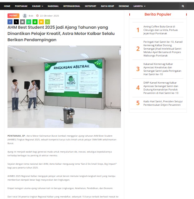 AHM Best Student 2025 jadi Ajang Tahunan yang Dinantikan Pelajar Kreatif, Astra Motor Kalbar Selalu Berikan Pendampingan by masmul 22 Oktober 2025 in Silahkan kunjungi https://www.suarapemredkalbar.com/read/potret/22102025/ahm-best-student-2025-jadi-ajang-tahunan-yang-dinantikan-pelajar-kreatif-astra-motor-kalbar-selalu-berikan-pendampingan. You Might Like Regional Public Launching New ADV160 The SUV Pride Grand Launching New PCX 160 Truly Exceptional! Tetap hati-hati ya bro sist berkendara saat hujan.
