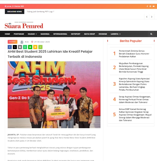 AHM Best Student 2025 Lahirkan Ide Kreatif Pelajar Terbaik di Indonesia by masmul 29 Oktober 2025 in Silahkan kunjungi https://www.suarapemredkalbar.com/read/potret/29102025/ahm-best-student-2025-lahirkan-ide-kreatif-pelajar-terbaik-di-indonesia. You Might Like Regional Public Launching New ADV160 The SUV Pride Grand Launching New PCX 160 Truly Exceptional! Tetap hati-hati ya bro sist berkendara saat hujan.