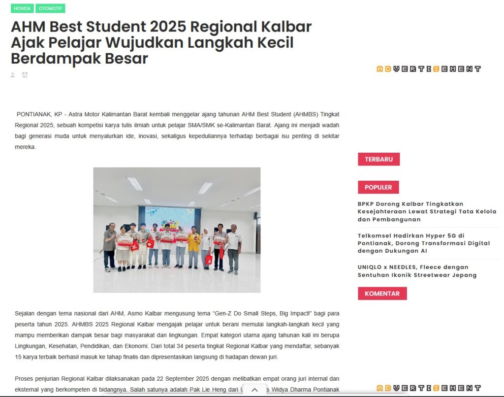 AHM Best Student 2025 Regional Kalbar Ajak Pelajar Wujudkan Langkah Kecil Berdampak Besar by Muhammad Arif 5 Oktober 2025 in Silahkan kunjungi https://www.kapuaspost.web.id/2025/10/ahm-best-student-2025-regional-kalbar.html. Tags: astra Astra Motor kalbar Astra Motor Pontianak astramotor honda kalbar pontianak sepeda motor You Might Like Regional Public Launching New ADV160 The SUV Pride Grand Launching New PCX 160 Truly Exceptional! Tetap hati-hati ya bro sist berkendara saat hujan.