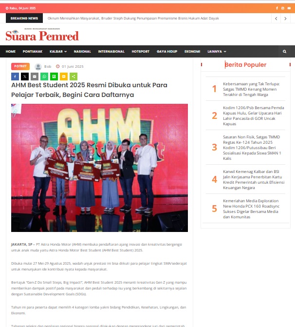 AHM Best Student 2025 Resmi Dibuka untuk Para Pelajar Terbaik, Begini Cara Daftarnya by masmul 1 Juni 2025 in Silahkan kunjungi https://www.suarapemredkalbar.com/read/potret/01062025/ahm-best-student-2025-resmi-dibuka-untuk-para-pelajar-terbaik-begini-cara-daftarnya. You Might Like Regional Public Launching New ADV160 The SUV Pride Grand Launching New PCX 160 Truly Exceptional! Tetap hati-hati ya bro sist berkendara saat hujan.