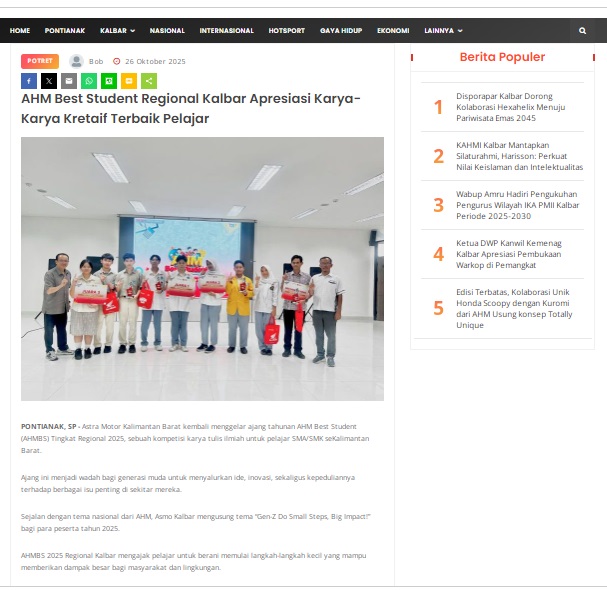 AHM Best Student Regional Kalbar Apresiasi Karya-Karya Kretaif Terbaik Pelajar by masmul 26 Oktober 2025 in Silahkan kunjungi https://www.suarapemredkalbar.com/read/potret/26102025/ahm-best-student-regional-kalbar-apresiasi-karya-karya-kretaif-terbaik-pelajar. You Might Like Regional Public Launching New ADV160 The SUV Pride Grand Launching New PCX 160 Truly Exceptional! Tetap hati-hati ya bro sist berkendara saat hujan.