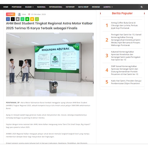 AHM Best Student Tingkat Regional Astra Motor Kalbar 2025 Terima 15 Karya Terbaik sebagai Finalis by masmul 23 Oktober 2025 in Silahkan kunjungi https://www.suarapemredkalbar.com/read/potret/23102025/ahm-best-student-tingkat-regional-astra-motor-kalbar-2025-terima-15-karya-terbaik-sebagai-finalis. You Might Like Regional Public Launching New ADV160 The SUV Pride Grand Launching New PCX 160 Truly Exceptional! Tetap hati-hati ya bro sist berkendara saat hujan.