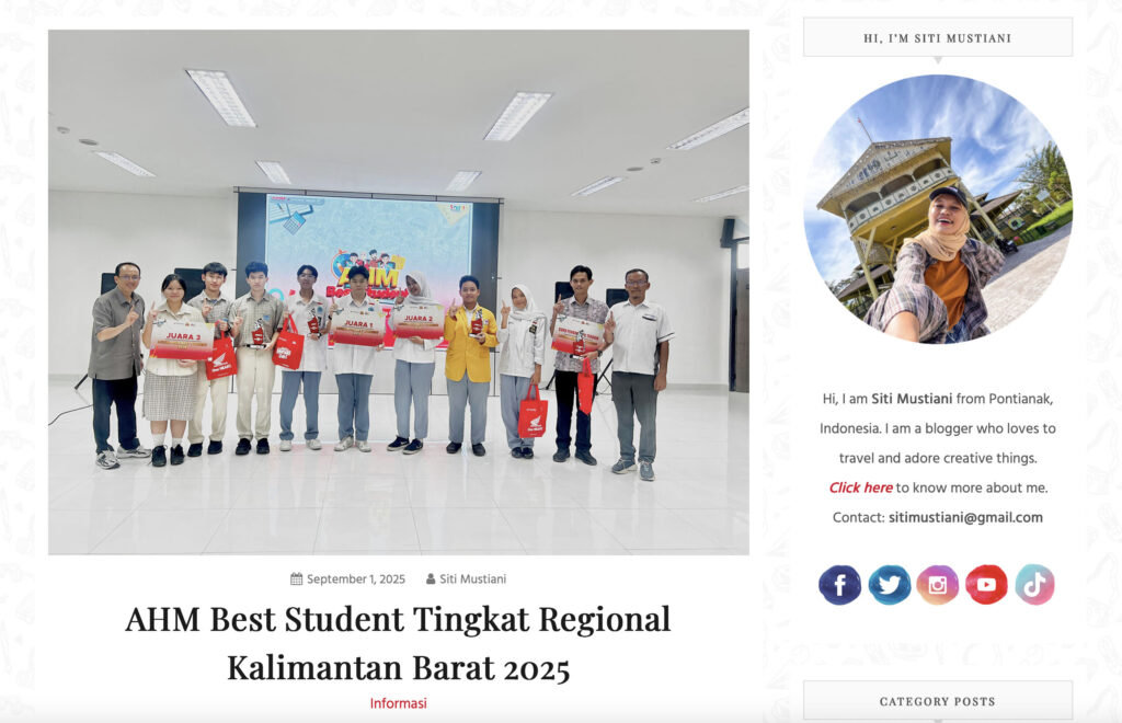 AHM Best Student Tingkat Regional Kalimantan Barat 2025 by Siti Mustiani 22 September 2025 in Silahkan kunjungi https://sitimustiani.com/2025/09/ahm-best-student-tingkat-regional-kalimantan-barat-2025/. Tags: ahm ahm best student AHMBS AHMBS 2025 Astra Honda Motor Astra Motor Kalimantan Barat Honda Kalbar Sustainable Development Goals Siti Mustiani http://www.sitimustiani.com Love to travel and adore creative things ✨ You Might Like Regional Public Launching New ADV160 The SUV Pride Grand Launching New PCX 160 Truly Exceptional! Tetap hati-hati ya bro sist berkendara saat hujan.