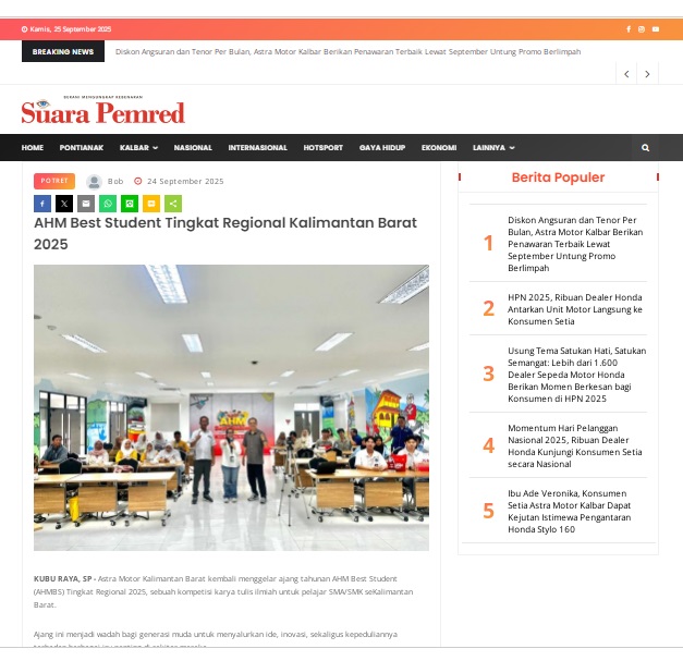 AHM Best Student Tingkat Regional Kalimantan Barat 2025 by masmul 24 September 2025 in Silahkan kunjungi https://www.suarapemredkalbar.com/read/potret/24092025/ahm-best-student-tingkat-regional-kalimantan-barat-2025. You Might Like Regional Public Launching New ADV160 The SUV Pride Grand Launching New PCX 160 Truly Exceptional! Tetap hati-hati ya bro sist berkendara saat hujan.