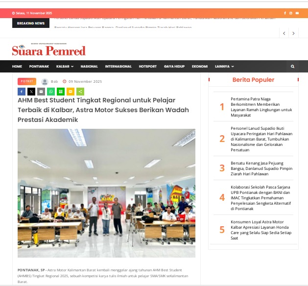 AHM Best Student Tingkat Regional untuk Pelajar Terbaik di Kalbar, Astra Motor Sukses Berikan Wadah Prestasi Akademik by masmul 9 November 2025 in Silahkan kunjungi https://www.suarapemredkalbar.com/read/potret/09112025/ahm-best-student-tingkat-regional-untuk-pelajar-terbaik-di-kalbar-astra-motor-sukses-berikan-wadah-prestasi-akademik. You Might Like Regional Public Launching New ADV160 The SUV Pride Grand Launching New PCX 160 Truly Exceptional! Tetap hati-hati ya bro sist berkendara saat hujan.