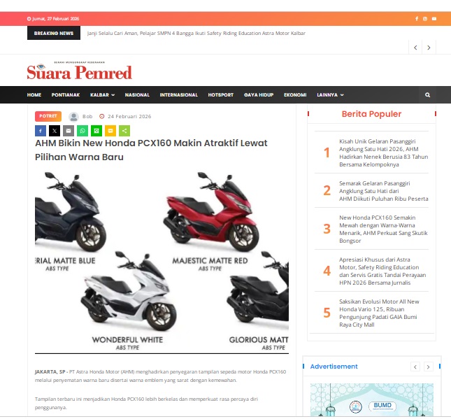 AHM Bikin New Honda PCX160 Makin Atraktif Lewat Pilihan Warna Baru by masmul 24 Februari 2026 in Silahkan kunjungi https://www.suarapemredkalbar.com/read/potret/24022026/ahm-bikin-new-honda-pcx160-makin-atraktif-lewat-pilihan-warna-baru. You Might Like Regional Public Launching New ADV160 The SUV Pride Grand Launching New PCX 160 Truly Exceptional! Tetap hati-hati ya bro sist berkendara saat hujan.