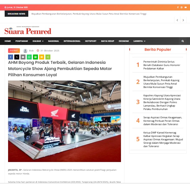 AHM Boyong Produk Terbaik, Gelaran Indonesia Motorcycle Show Ajang Pembuktian Sepeda Motor Pilihan Konsumen Loyal by masmul 31 Oktober 2025 in Silahkan kunjungi https://www.suarapemredkalbar.com/read/potret/31102025/ahm-boyong-produk-terbaik-gelaran-indonesia-motorcycle-show-ajang-pembuktian-sepeda-motor-pilihan-konsumen-loyal. You Might Like Regional Public Launching New ADV160 The SUV Pride Grand Launching New PCX 160 Truly Exceptional! Tetap hati-hati ya bro sist berkendara saat hujan.