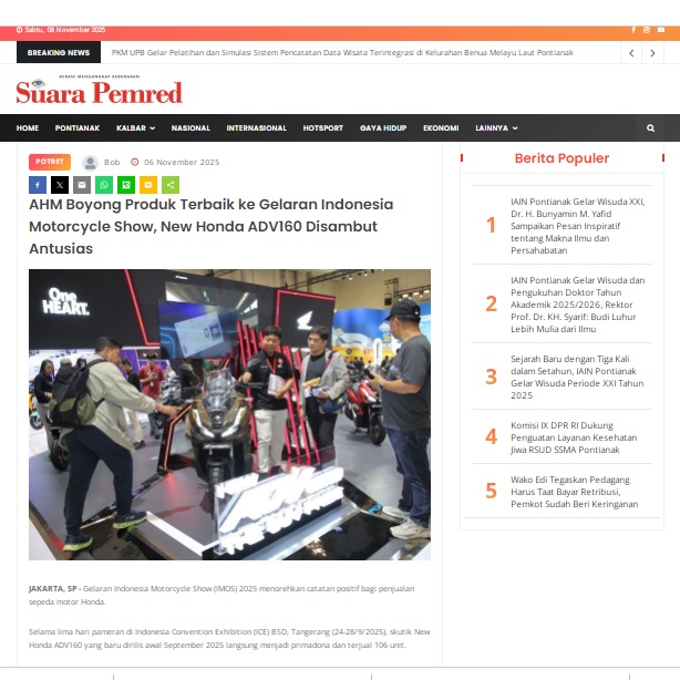 AHM Boyong Produk Terbaik ke Gelaran Indonesia Motorcycle Show, New Honda ADV160 Disambut Antusias by masmul 6 November 2025 in Silahkan kunjungi https://www.suarapemredkalbar.com/read/potret/06112025/ahm-boyong-produk-terbaik-ke-gelaran-indonesia-motorcycle-show-new-honda-adv160-disambut-antusias. You Might Like Regional Public Launching New ADV160 The SUV Pride Grand Launching New PCX 160 Truly Exceptional! Tetap hati-hati ya bro sist berkendara saat hujan.