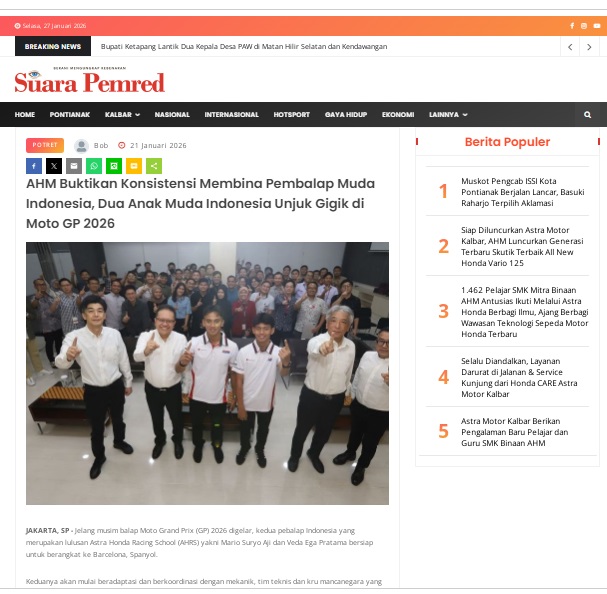 AHM Buktikan Konsistensi Membina Pembalap Muda Indonesia, Dua Anak Muda Indonesia Unjuk Gigik di Moto GP 2026 by masmul 21 Januari 2026 in Silahkan kunjungi https://www.suarapemredkalbar.com/read/potret/21012026/ahm-buktikan-konsistensi-membina-pembalap-muda-indonesia-dua-anak-muda-indonesia-unjuk-gigik-di-moto-gp-2026. You Might Like Regional Public Launching New ADV160 The SUV Pride Grand Launching New PCX 160 Truly Exceptional! Tetap hati-hati ya bro sist berkendara saat hujan.