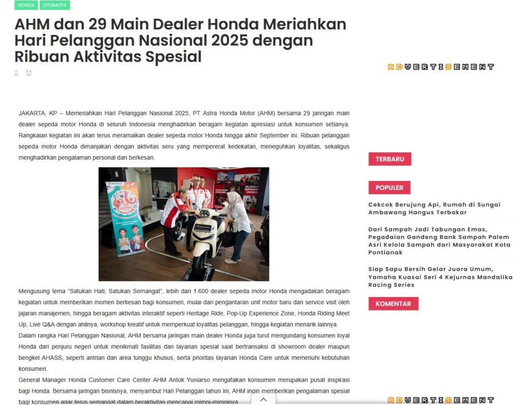 AHM dan 29 Main Dealer Honda Meriahkan Hari Pelanggan Nasional 2025 dengan Ribuan Aktivitas Spesial by Muhammad Arif 21 September 2025 in Silahkan kunjungi https://www.kapuaspost.web.id/2025/09/ahm-dan-29-main-dealer-honda-meriahkan.html. Tags: astra Astra Motor kalbar Astra Motor Pontianak astramotor honda kalbar pontianak sepeda motor You Might Like Regional Public Launching New ADV160 The SUV Pride Grand Launching New PCX 160 Truly Exceptional! Tetap hati-hati ya bro sist berkendara saat hujan.